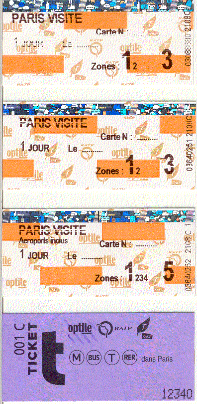 RTAP (Franciaország, Párizs) napi jegyek és egy szakaszjegy. Ezek mágnescsíkosak, és különbőző zónákra szólnak:
