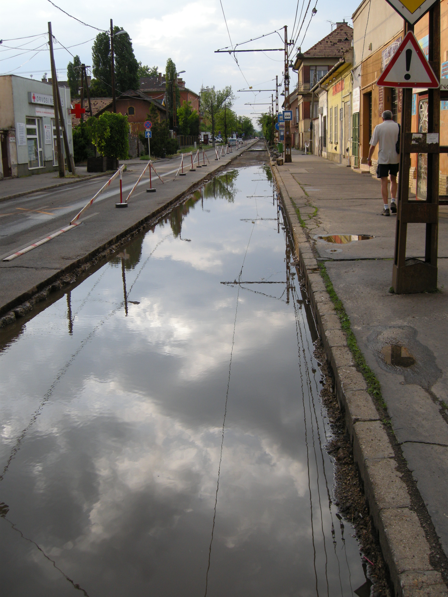 Azt láttuk, hogy a paneleket vizes alapra (eső után) rakták le, lásd a képet. Ha az aljzat a panel alatt még nem száradt meg, akkor (40t villamos és 40t buszforgalom hatására) a döngölt aljzat a panellel együtt megsüllyedhet, a pálya és az úttest egyenletlenné válhat, később pedig a panel megrepedhet, majd még később kettétörhet.